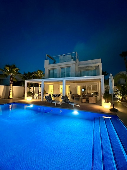 Vestvendt enebolig. Fra takterrassen er det 360 graders utsikt mot hav, fjell og spektakulær solnedgang. Mulighet for sol og skygge til alle tider. Sentralt beliggende vs by, strender og flyplass, i stille og rolig nabolag. Førsteklasses aktivitetsmuligheter for sykkel, tennis, golf.