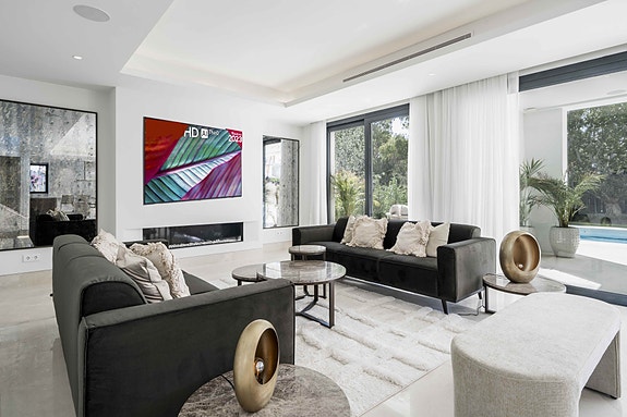Denne elegante moderne villaen ligger i det eksklusive El Campanario golfområdet på New Golden Mile, og er bygget med høyeste kvalitet materialer og utstyrt med toppmoderne installasjoner. Omgitt av frodige tropiske hager, eiendommen er en del av et levende fellesskap med en ni-hulls golfbane og et eksklusivt klubbhus som tilbyr et spa- og velværesenter, treningssenter, innendørs og utendørs svømmebasseng, coworkingplasser, en fin spiserestaurant og tennis- og paddlebaner. Dens beste beliggenhet er bare en kort kjøretur fra den glamorøse Puerto Banús og nær solfylte strender og viktige fasiliteter.