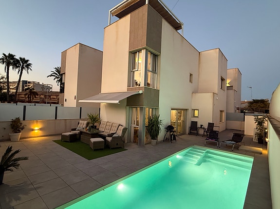 Velkommen til denne vakkert vedlikeholdte private villaen midt i hjertet av San Javier, kun en kort spasertur på 300 meter til de fredelige strendene ved Mar Menor. Bygget i 2019, kombinerer eiendommen moderne design, høykvalitetsfunksjoner og en rolig beliggenhet ved kysten – ideell som helårsbolig, feriested eller som en investeringseiendom med høy leieavkastning.