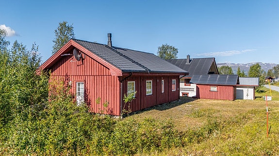 Huset ligger på en plan och insynsskyddad hörntomt med goda parkeringsmöjligheter och ett praktiskt kallförråd med el. Uteplatsen sträcker sig längs med gaveln och baksidan – perfekt för vårsolens första strålar eller grillkvällar efter en dag på fjället.
