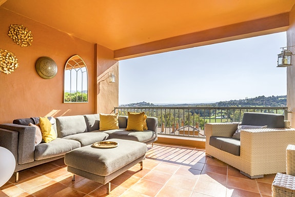 Leiligheten ligger på første linje mot Atalaya Golf, med romslig stue, separat kjøkken med eget vaskerom, samt to private parkeringsplasser i garasje og en bod. Den vestvendte orienteringen gir ettermiddagssol og spektakulære solnedganger, med panoramautsikt til Middelhavet, Afrika, Gibraltar, Atalaya Golf og åsene bak.