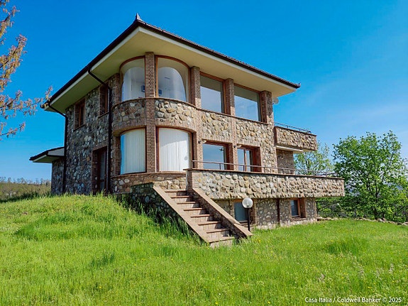 Utvendig er villaen steinsatt med en unik type vulkansk stein fra Paglia-elven, som sammen med de store panoramavinduene gir bygget et særegent preg.