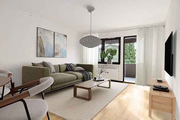 Ett ljust och luftigt vardagsrum med gott om plats för både soffgrupp och extra matgrupp för den som det önskar. Här ges med andra ord goda chanser till både umgänge och avkoppling. Väggarna är tapetserade och golvet är av parkett. Härifrån når ni även lägenhetens balkong där man gärna avnjuter dagarna under den varmare delen av året.