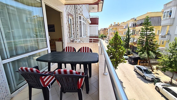 2 roms leilighet m/balkong og basseng i rolig sidegate midt i Alanya, 100 m fra strand.