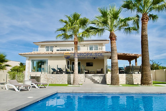 Enestående sydvendt villa i svært attraktivt boligstrøk sentralt beliggende mellom Alfaz del Pi og Albir. Villaen og uteområdene ble totalrenovert i 2023 i moderne design og med bruk av materialer av ypperste kvalitet og er smakfullt innredet. Villaen har to etasjer samt kjeller og består av en romslig og svært lys og luftig stue / spisestue med åpen kjøkkenløsning, samt et kontor / soverom og separat bad i første etasje. Andre etasje består av tre soverom og to bad, hvorav to soverom har bad ensuite. Fra disse to soverommene er det også tilgang til en stor terrasse med jacuzzi og panoramautsikt mot fjellene og skyline Benidorm. Fra stuen er det tilgang til en stor og flott overbygget terrasse med grillområde og sommerkjøkken, og med tilgang til hagen og svømmebassenget. Hageområdet velstelt og krever lite vedlikehold. Svømmebassenget er på hele 11x5 meter, og det er også et område med opplyst petanca-bane og putting green for golf. I kjelleren er det en stor garasje og mye lagringsplass, vaskerom og teknisk rom. Kjelleren og øvrige etasjer er forbundet med en innvendig trapp. Villaen er utstyrt med doble vinduer med elektriske persienner, varmt/kaldt klimaanlegg, gulvvarme, LED-belysning i tak, kraftig solcelleanlegg med batteri, alarmsystem, filter for drikkevann, utendørsbelysning etc. Eiendommen ligger i et rolig boligområde, men har likevel svært sentral beliggenhet med kun 8 min å gå til nærmeste supermarked og fredagsmarkedet i Alfaz og 15 min å gå til sentrum av Alfaz del Pi med alt av fasiliteter.