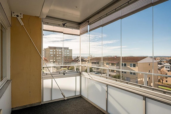 Trivsam trea med balkong i västerläge och utsikt över takåsar och Kyrkviken
