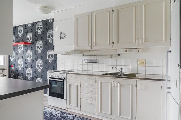 Kök med laminatgolv och tapetserade väggar. Köksinredningen består av ljusa luckor/lådor, rostfri diskbänk och bänkskiva i laminat samt vitt kakel som stänkskydd. Den maskinella utrustningen består av spis, spisfläkt, kyl och frys. Här finns utgång till den till inglasade balkongen.