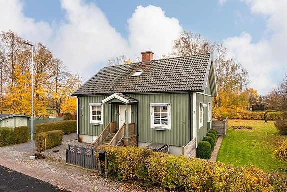 På övre plan hittar vi två sovrum med goda förvaringsutrymmen samt ett badrum med badkar. På källarplan finns flera förrådsutrymmen med bland annat tvättmaskin och utgång till trädgård.