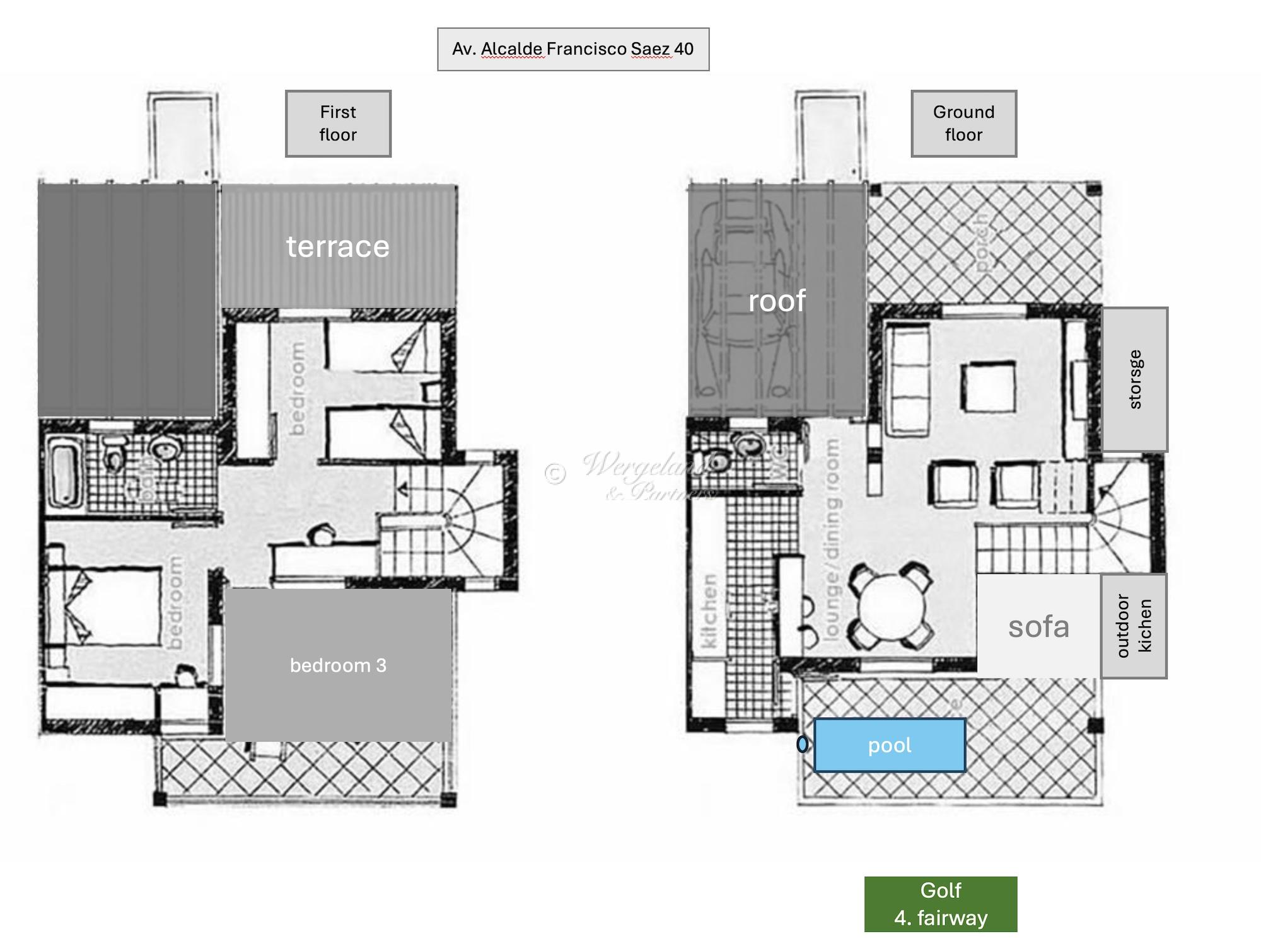 Utvidet lyst, åpent og romslig rekkehus. 100 m2 boareale. I første etasje er det gjestetoalett, flott og innholdsrikt kjøkken med kjøkkenøy mot spisestue/dagstue med utsikt over basseng og golfbane. Separat TV-stue med to sofaer. Mulighet til å lukke med glassdører. Trapp til 2. etg. med 3 soverom og 2 bad (ett én-suite). Koselig sørvendt terrasse. Det private bassenget er saltvannsbasseng og i tillegg får du utekjøkken og to boder på den 202 m2 store tomten.