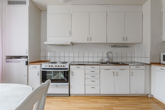 Kök med laminatgolv och målade väggar. Köket är inrett med släta vita köksluckor och rostfri bänkskiva med kakel över som stänkskydd. Den Maskinell utrustning bestående av spis, spisfläkt, kyl och frys. I köket får man plats för matbord med plats för 4-6 stolar.