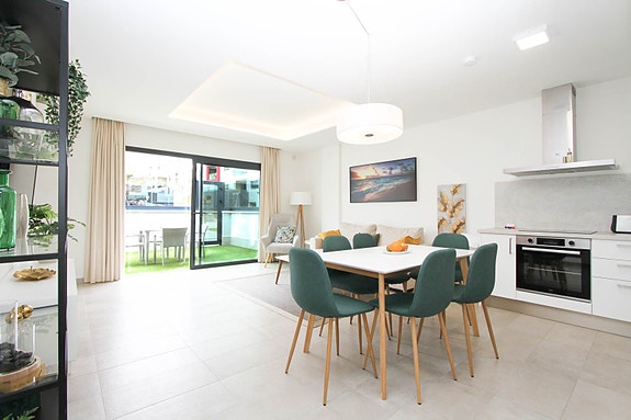 Boligen på 70m2 har i tillegg en 19m2 stor terrasse med direkte utgang til bassenget og det flotte fellesområdet. Terrassen har høye fargede glass vegger og dør som kan låses, noe som gjør leiligheten trygg og ideell for barnefamilier eller personer som vil ha enkel tilgang til bassenget. Stuen er ikke bare et koselig sted å slappe av, men gir også overnattingsmuligheter for flere da den har sovesofa med plass til 2 personer. Åpen planløsning mot et fullt utstyrt kjøkken og spisebord. Aircondition.