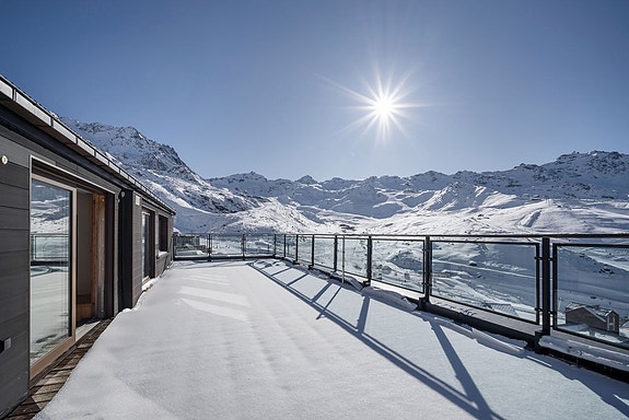 De moderne, fullt utstyrte kjøkkenene er åpne mot romslige stuer- og spiseområder med rikelig naturlig lys. Store vindusflater fører ut til en privat terrasse på 70 m². Bod i kjeller. Sol hele dagen, med panoramautsikt over fjellene, løypene og sentrum av resorten.