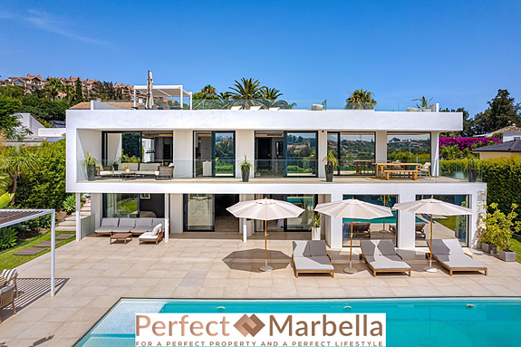Denne fantastiske villaen med beliggenhet rett ved den prestisjefylte golfbanen, Los Naranjos Golf Club, ligger i et av Marbellas mest eksklusive områder som kombinerer både sofistikert arkitektur og komfort.