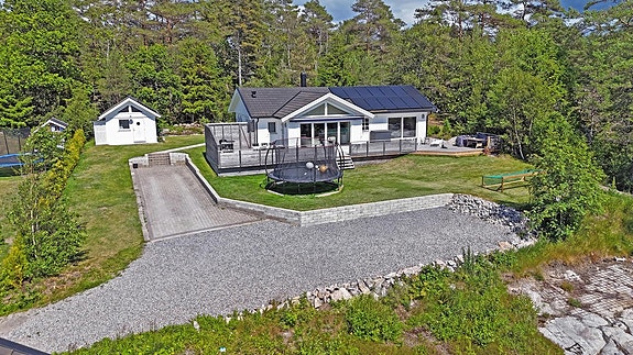 Uteplatsen är en riktig oas där solen skiner generöst under många timmar. Här kan du koppla av med en bok, umgås med vänner eller avnjuta en härlig grillmiddag. Den stora tomtarea på 973 kvadratmeter ger dig gott om utrymme för både lek och avkoppling.