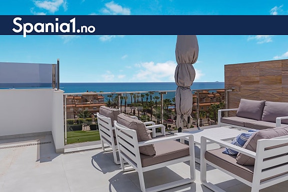 I ettertraktede Cabo Roig, kun et kort gangavstand fra strand, restauranter, marina og servicetilbud, ligger denne toppleiligheten med store utearealer og utsikt mot Middelhavet. Området regnes som et av de mest etablerte og populære langs Orihuela Costa, med et godt miljø året rundt og nærhet til alt man trenger i hverdagen og i ferier.