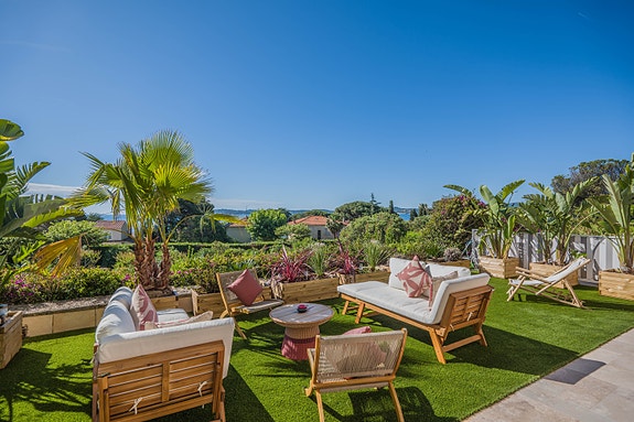 Inngjerdet og pent beplantet hage i forbindelse med terrassen.
