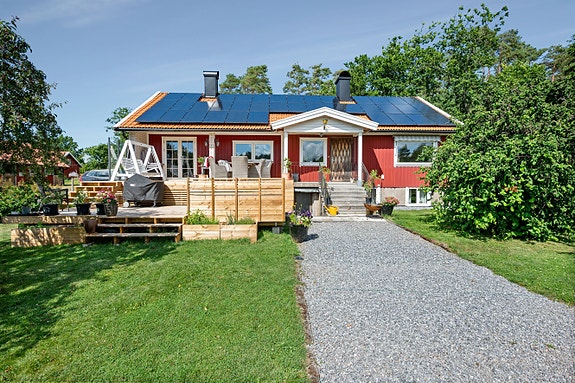 För den trädgårdsintresserade erbjuds både växthus, pallkragar och en grönskande trädgård med gräsmatta, blomsterbäddar och fruktträd.