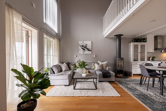 En trappa upp hittar du ytterligare ett allrum som idag är möblerat med hörnsoffa och tv samt kontorshörna. Utöver allrummet finns på våningsplanet tre sovrum samt ett badrum med dusch. Alla fyra av bostadens sovrum har plats för dubbelsäng och idag är det endast det på entréplan och det största sovrummet på övre plan som är möblerat så. Två av sovrummen på övre plan är möblerade som barnrum. Intill huvudentrén finns förråd som skapar fina förvaringsmöjligheter och på tomten finns ett fristående uppvärmt förråd om ca 10kvm med plats för cyklar, arbetsbänk och en extra frysbox. Här kan du med fördel förvara såväl jullådan som verktygslådan.