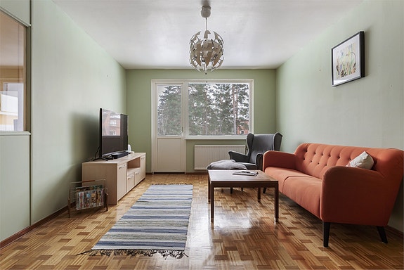 Rymligt vardagsrum med anslutning till balkongen. Här ligger det ett parkettgolv, väggarna är målade.