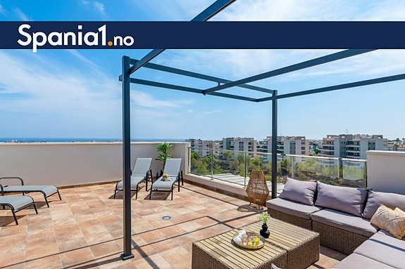 Vi har gleden av å presentere en av de flotteste leilighetene i det populære boligkomplekset Green Hills – beliggende like ovenfor La Zenia. Dette er en sørvestvendt toppleilighet (penthouse) med 3 soverom, 2 delikate bad med gulvvarme, en stor innglasset terrasse utenfor stuen, samt en privat takterrasse (takterrasse) med pergola og utedusj. Herfra har man vakker utsikt over grøntområder og Middelhavet.