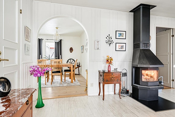 Bostaden erbjuder ett modernt och rymligt kök med uppdaterade vitvaror, ett ljust vardagsrum med utgång till altan samt ett inglasat uterum som förlänger säsongen. Det generösa allrummet fungerar utmärkt som extra sällskapsyta och här finns även en stämningsfull kamin. Planlösningen rymmer också tre sovrum – med möjlighet att skapa ett fjärde vid behov – där ett av rummen passar perfekt som kontor eller gästrum. Vidare finns badrum, separat gäst-WC samt en egen tvättstuga med groventré.