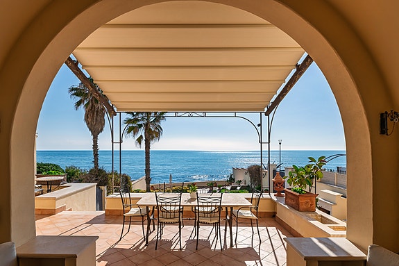 The exterior envelope was designed — and has been continuously refined — for the serious alfresco life. White-washed architectural elements frame the sea on multiple axes. The 500 m² / 5,382 sq ft of grounds incorporate terraces at several levels, each with a distinct function: al fresco dining under electric pergolas and awnings installed in 2023–24, a shaded lounge area, and an automated irrigated garden with outdoor showers. The visual language is Mediterranean without affectation — closer to a Cycladic island estate than the over-furnished terraces common to coastal Italian properties.