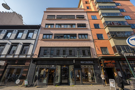 Øvre Slottsgate 17 er en klassisk bygård over seks etasjer med handel i 1.etasje og kontorer fra 2 til 6.etasje.