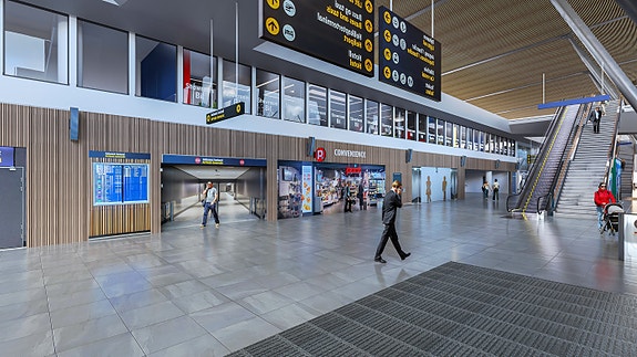 Lokalet ligger i 2. etasje i ankomsthallen med god eksponering mot de mange reisende.