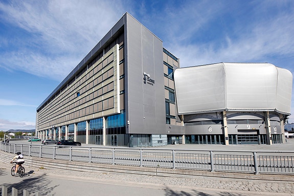 Bygget ligger rett ved første rundkjøring, helt inntil Snarøyveien, på vei videre utover Fornebu. Godt synlig fra veien.