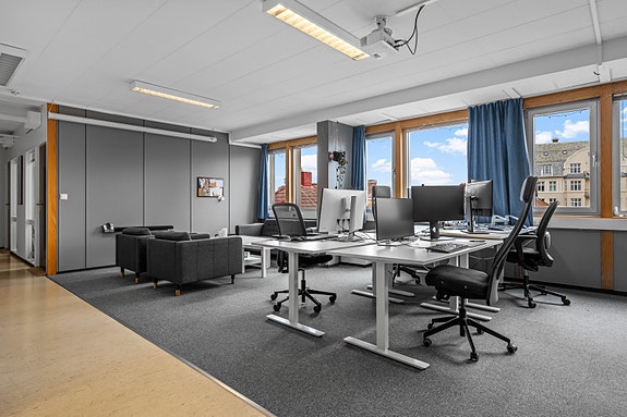 Det blir nå et ledig areal i byggets 3. etasje, på ca. 164 m2. Arealet består av en kombinasjon av kontorceller og åpent lanskap, og har et tilhørende tekjøkken.