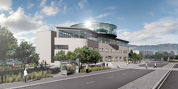 Mulighet for "skreddersøm" - lokaler til handel, kontor, helserelatert, trening eller annen representativ bruk fra ca. 200 kvm. Illustrasjonsbilde fra mulighetsstudie viser ny fasade og ny hovedinngang i front av bygget.