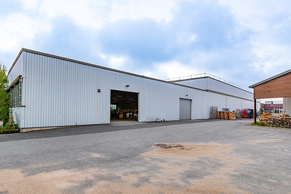 Stålbygg med isolerte vegger påsatt stålplater, støpte gulv, flatt tak tekket med takpapp eller lignende. kjøreport.