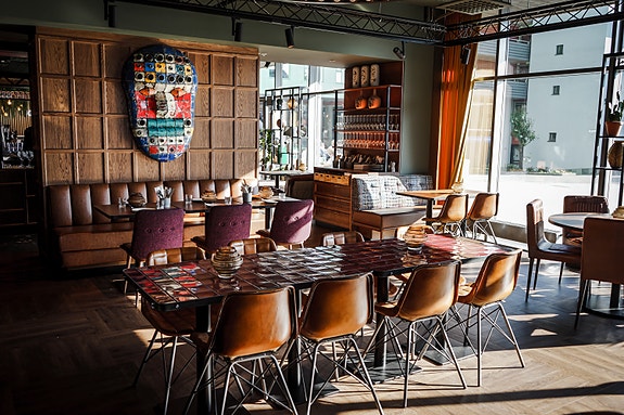Kombinasjonen av naturlige materialer, varme farge og fleksible sittegrupper gir restauranten en moderne, urban og sosial atmosfære. Lokalene har store vindusflater som gir god og naturlig belysning.