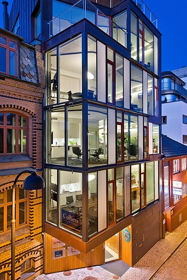 Lokalene er moderne, lyse og svært funksjonelle. Fasader med viduer fra gulv til tak slipper inn mye dagslys.