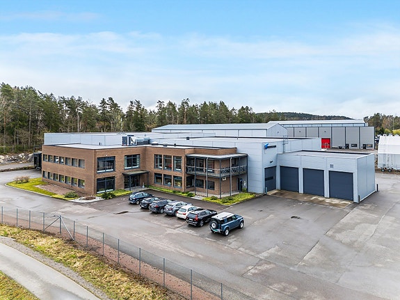 Kombinasjonseiendom med lager, laboratorium og kontor. Inngjerdet tomt.