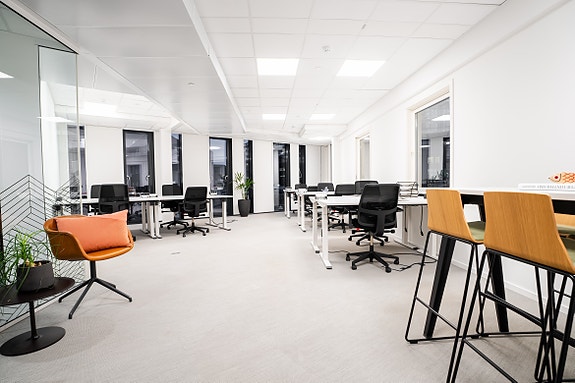 La teamet og bedriften vokse med åpent kontorlandskap på 55 m² i Spaces Nydalen, perfekt for 13 ansatte. Våre store kontorer er fullt betjente og tilgjengelige døgnet rundt, og de inkluderer ubegrenset coworking-tilgang til vår business club i arbeidstiden. Og fordi vi vet hvor raskt forretningsverdenen kan endre seg, ber vi deg aldri om langvarige forpliktelser – kontraktperiodene våre er fleksible, og skreddersydde i henhold til dine konkrete behov.
