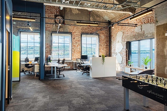 På Verket kan vi nå tilby lokaler med en helt spesiell kombinasjon av industriell sjarm og moderne standard og fasiliteter. Stor takhøyde, rå mursteinsvegger og store vinduer rammer inn den vakre sjøutsikten, og gir både arbeidsro og stimulerer til kreativitet og produktive arbeidsdager.