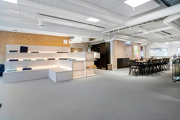 Åpen kontorløsning med tilhørende møterom og tribune.