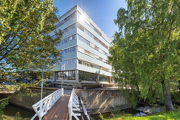 Nils Hansens vei 8 ligger flott til i grønne omgivelser like ved Alnaelva. Bygget har en tydelig profil og en fasade som skiller seg positivt ut i nærområdet.