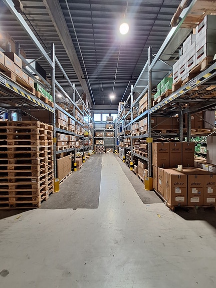 Høytlageret er LED-belyst og har svært god logistikkflyt, med egne klareringssoner for både inn- og utgående varer. I tillegg inneholder lokalet et praktisk demorom, mesanin og et ekspedisjonsrom som også kan fungere som kontor.