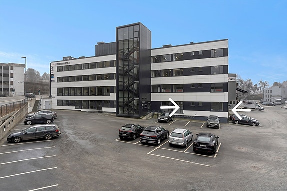 Det er godt med parkeringsareal utenfor bygget. Stor parkeringsplass med 45 plasser, inkludert 3 elbil-ladestasjoner.