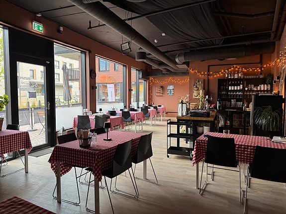 Serveringslokalet består av et åpent og funksjonelt areal på gateplan, med gode serveringsflater og fleksibel planløsning. Lokalet har store vindusflater som gir rikelig med dagslys og god synlighet mot nærområdet.
