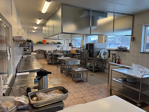 Et stort og lyst produksjonskjøkken eller catering, ca 150 kvm på Kalbakken. Er i daglig drift. Det er plass til mange arbeidsstasjoner og det er et lokale med mye dagslys. Det er godt med gratis parkering både til ansatte og kunder.