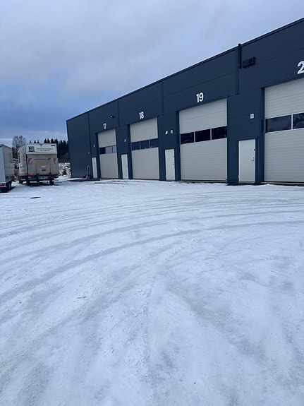 Bygget leveres med støvbundet betonggulv. Inngangsdører i lakkert stål og elektrisk industriport fra Hörman. (4 m bred og 4 m høy) Porten har fjernkontroll.