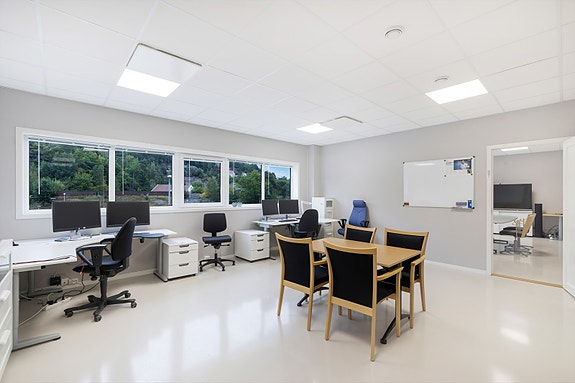 Den første kontordelen har eget inngangsparti og et bruksareal på 76 m². Arealet består p.t. av to store kontor, med mulighet for å installere kjøkken - lage våtrom og dele opp i flere cellekontorer. Epoxygulv, sparklet gips malt i duse, delikate farger. Lokalet ligger luftig til med fin utsikt og har nyere vinduer og dører, samt god takhøyde. Systemhimling med integrert ventilasjon og ledlys med dimmere. Fiber bredbånd med Wifi er montert og operativt. Varmepumpe montert i januar 2023, og det er installert nytt ventilasjonsanlegg for friskluft og varmeveksler til kontorlokalene. Lager/garasje delen har adkomst via port, sidedør eller dør i port. Lokalene har epoxygulv, ubehandlet gipsvegger, samt betonghimling med ledlys. Innvendige garasjeporter slik at egne eksklusive arealer kan leies ut separat -4 meters bredde. Innerst finnes det verksted/lager, ventilasjons rom, sprøyterom, bad, kjøkken, stort møterom/kontorareal og ekstra kontor innerst.
