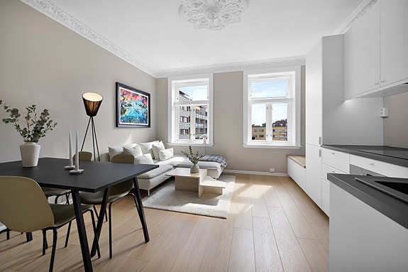 Gjennomgående 2-roms i klassisk bygård - Original rosett & stukkatur - Takhøyde 2,73 m - Gulvvarme - Meget høy standard