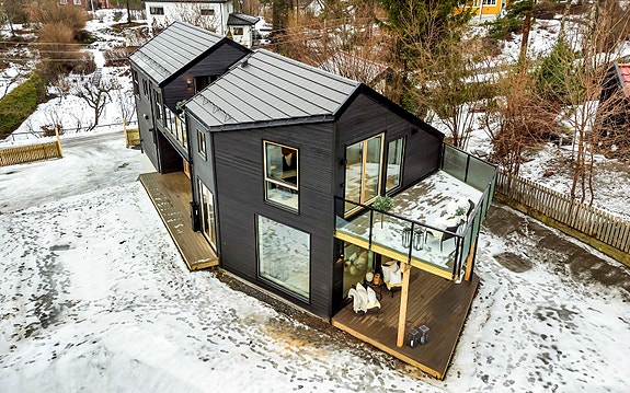 Boligen har flere flotte særpreg. Her sett ovenifra. Boligen vil få en flott opparbeidet tomt.