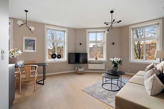 Leiligheten ligger i 4. etasje og har en gjennomgående løsning med store vindusflater og en generøs takhøyde som slippet lyset inn.