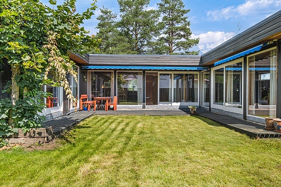 Spennende atriumhus i funkisstil med alt på ett plan. Gode solforhold. Barnevennlig. Oppussingsobjekt m/stort potensiale