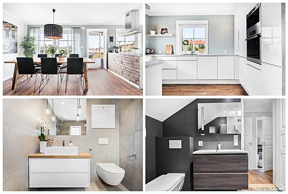 Badene fremstår som strøkne og er innredet med henholdsvis badekar og stor, deilig regnfallsdusj. Kjøkkenet har en delikat innredning (HTH) med integrerte hvitevarer, beliggende delvis åpent til en harmonisk stue. Stuen har fine lysforhold, spiseplass og stemningsfull peisovn. Videre har boligen fire gode soverom, samt lagringsplass i garderobeløsninger og boder.